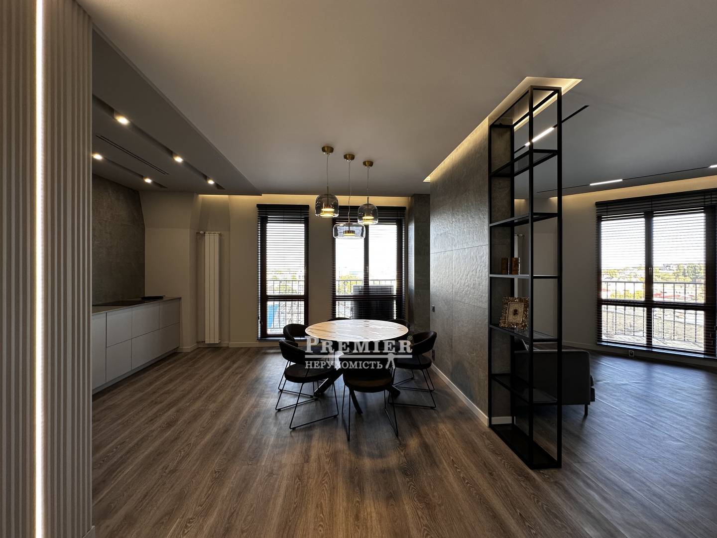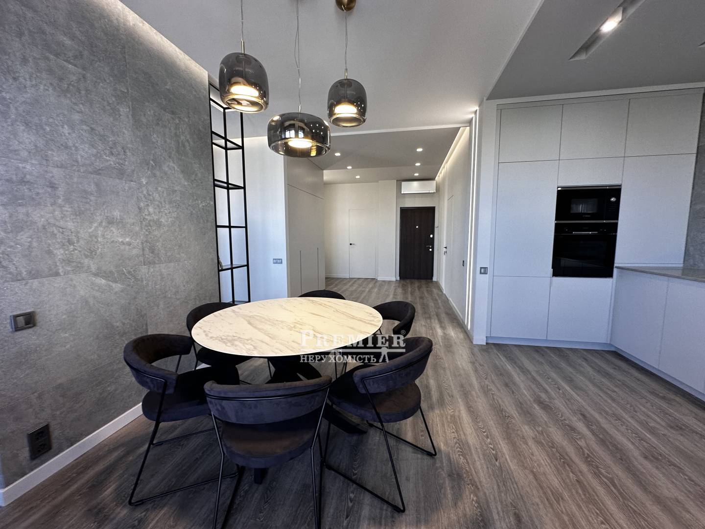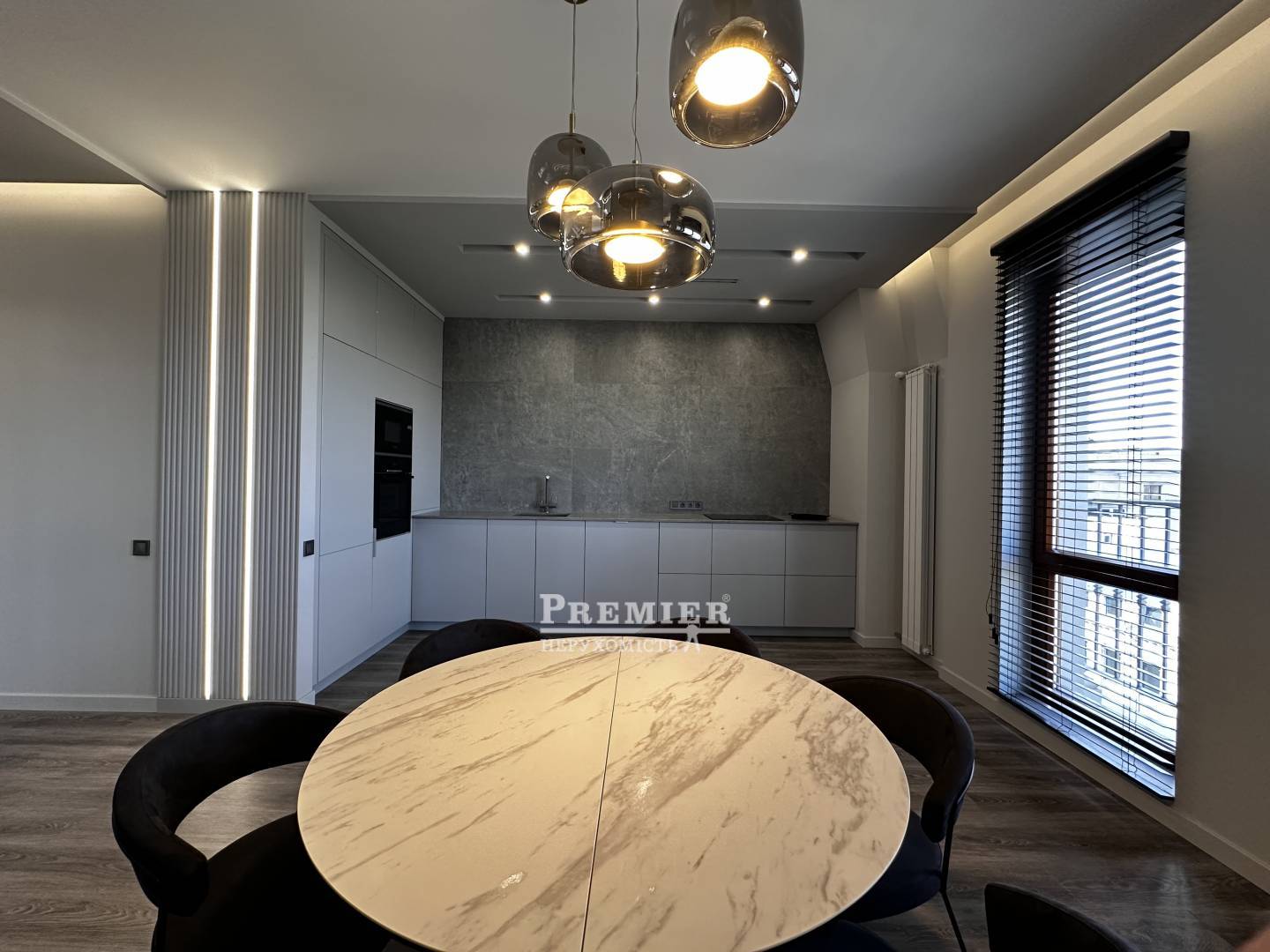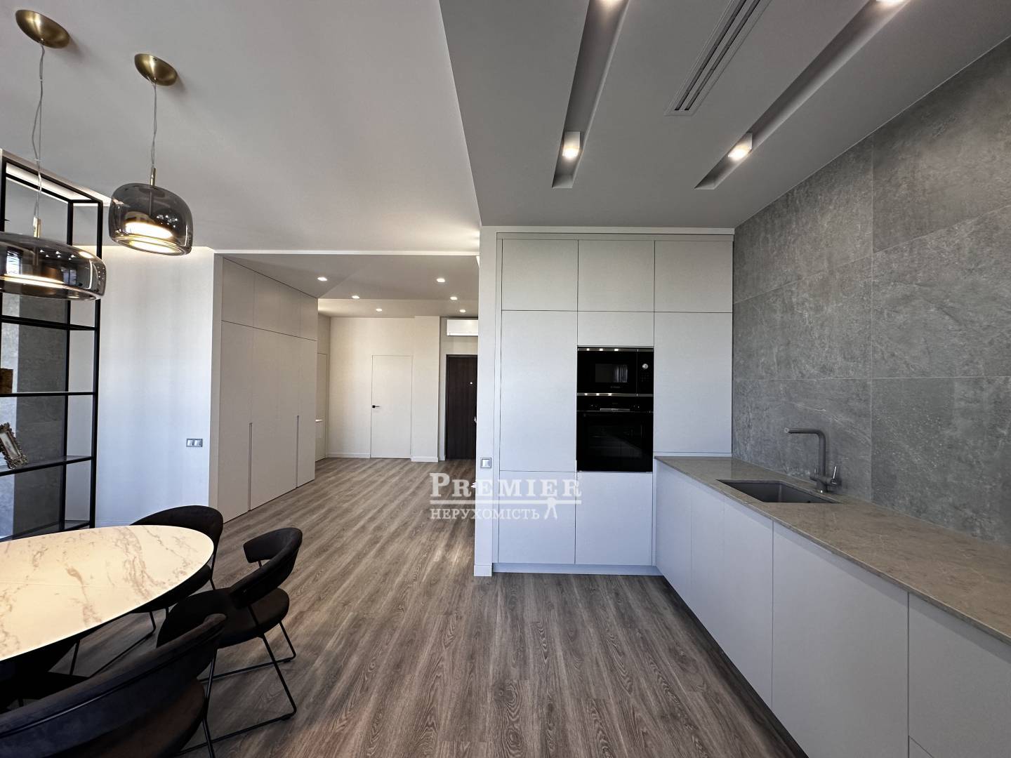 Светлые и просторные комнаты с современным дизайном создают ощущение уюта и роскоши. Просторная кухня-гостиная выполнена в минималистичном стиле с акцентом на премиальные материалы: каменные текстуры, встроенная мебель и продуманное освещение. Обеденная зона с круглым мраморным столом и дизайнерскими светильниками подчеркивает изысканность интерьера.