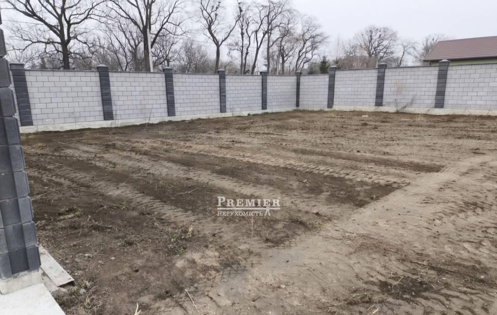 Выполнена планировка грунта. Впереди участка залита площадка для парковки автомобилей.