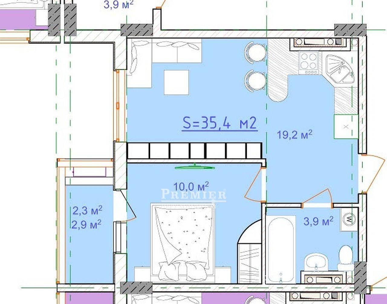 Квартира 35,4 кв.м. распланирована на обширную кухню-студию 19,2 кв.м, спальню 10 кв.м. с выходом на большую лоджию, санузел совместим. На лоджии можно сделать рабочий кабинет. Удачное расположение на этаже, соседи всего за 1 стенкой.