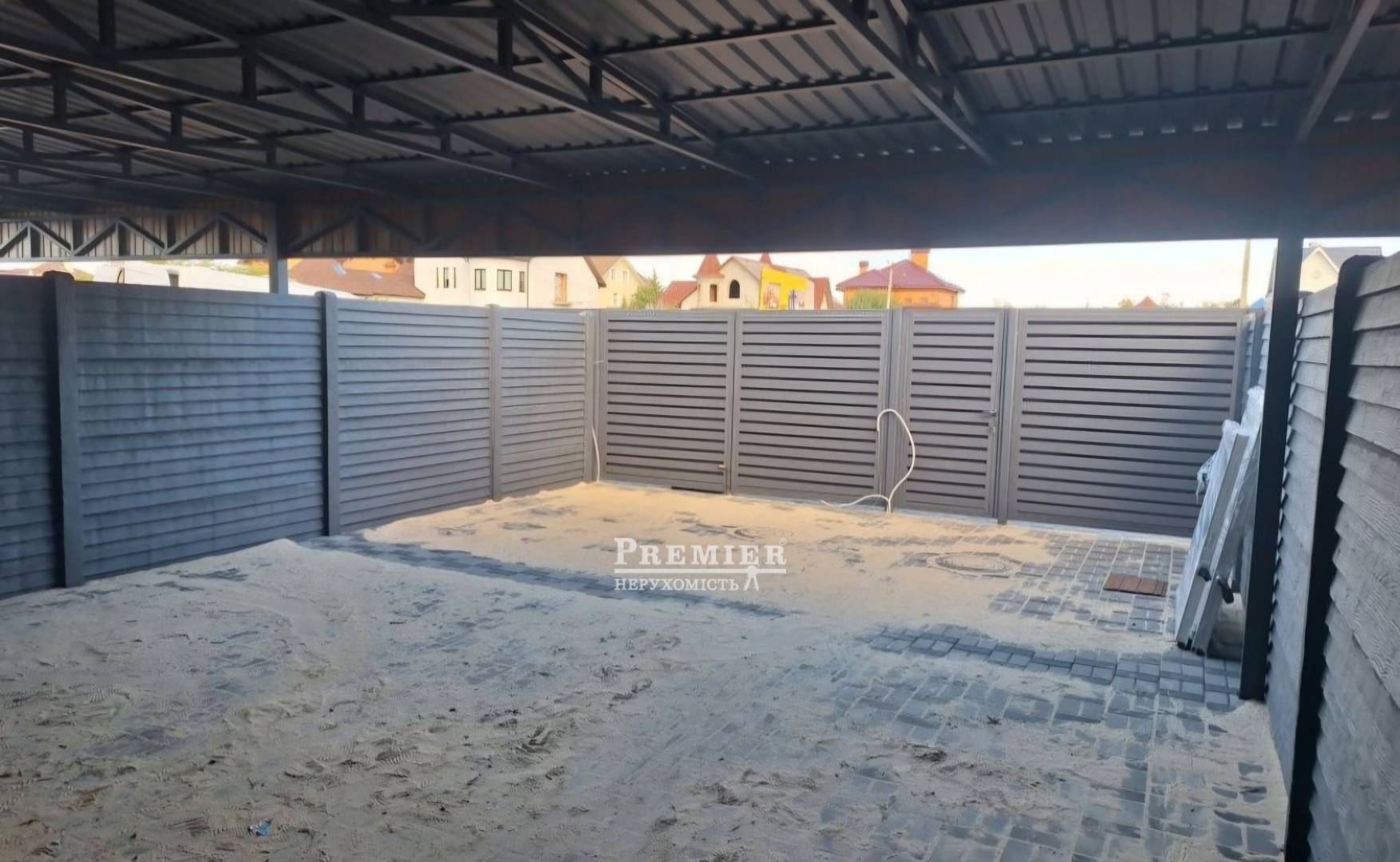 Фасад – металлический навес на два авто, ворота