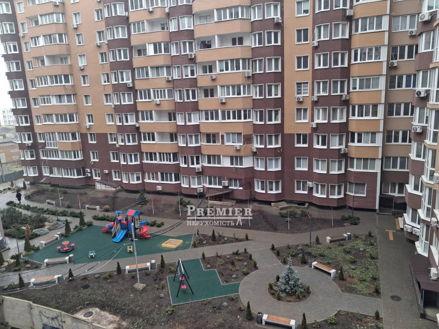 Современный закрытый двор, детская площадка, парковка.