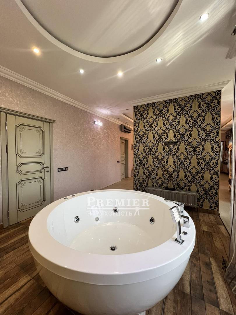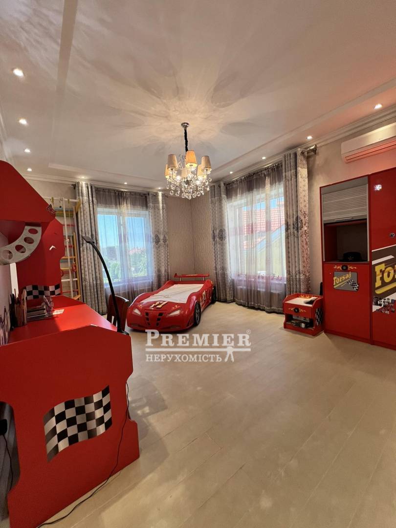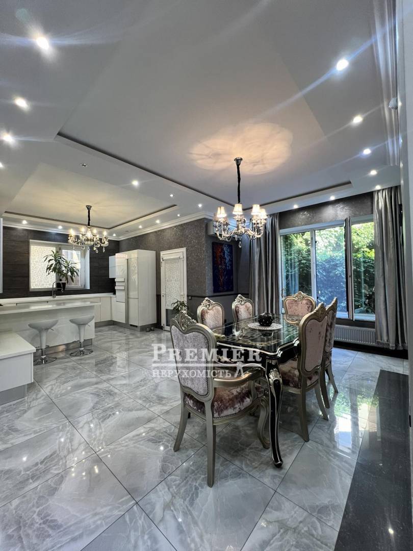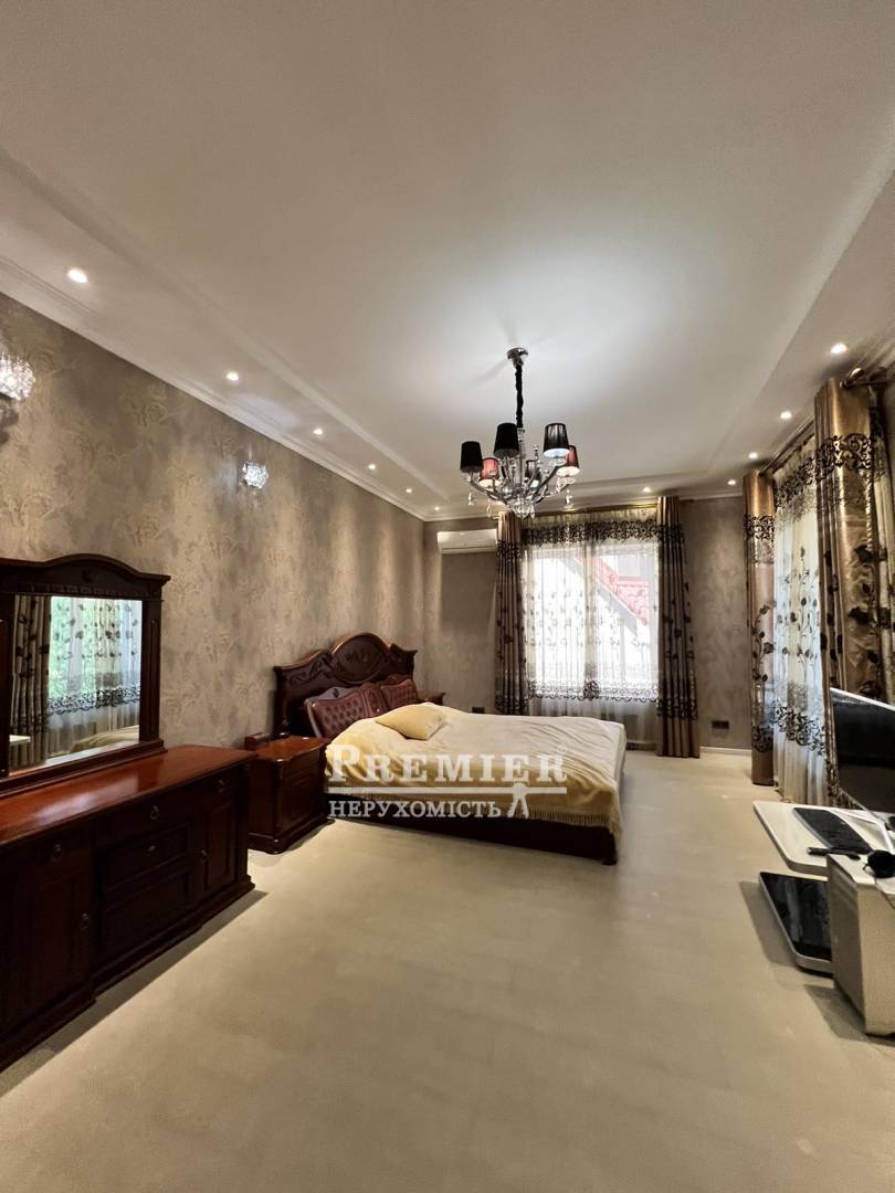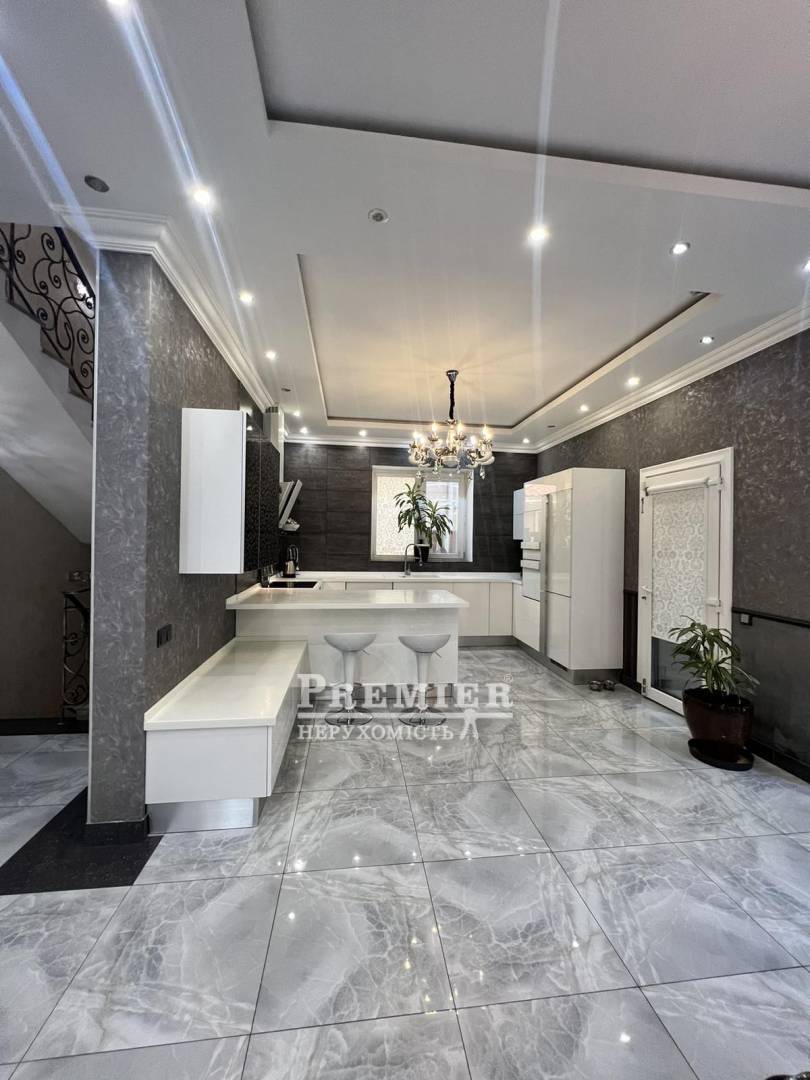 Пропонуються до продажу двоповерховий будинок з натурального каменю в чотири рівні на ділянці 8 сотів. На цокольному поверсі котельня, підсобні приміщення. На першому поверсі кухня – їдальня, дві спальні, пральня, суміжний санвузол. На другому поверсі три спальні, санвузол, одна зі спалень майстер - спальня з гардеробною, санвузлом та джакузі, та веранда під спортзал. Третій рівень: під домашній кінотеатр із акустикою, шумоізоляція. Будинок з черепашника фанерований цілісною червоною цеглою, сходи та цоколь з граніту, підвіконня мармур, є камін. На ділянці літня кухня з вбудованою технікою та меблями, басейн 4*8 кв.м, крите паркування на два автомобілі. Розвинена інфраструктура: поруч зупинка транспорту, супермаркети, магазини, школа, садок. До моря 10 хв. пішки.