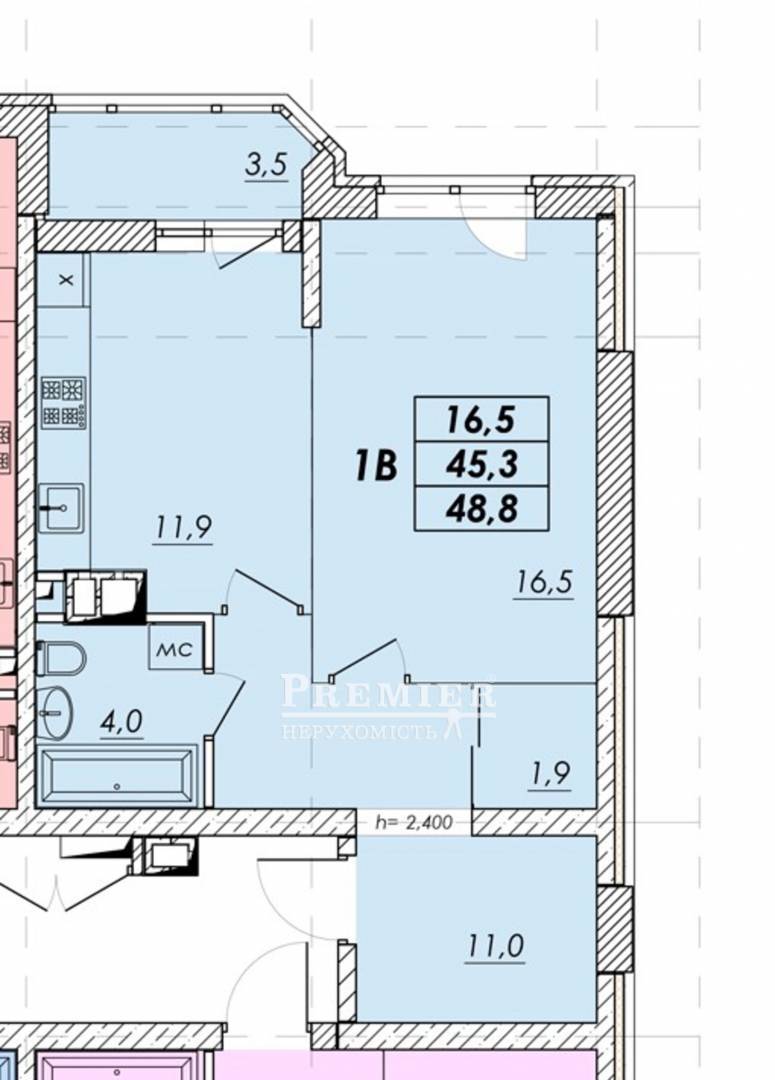 Кухня із виходом на балкон 12м2, кімната 16м2.
