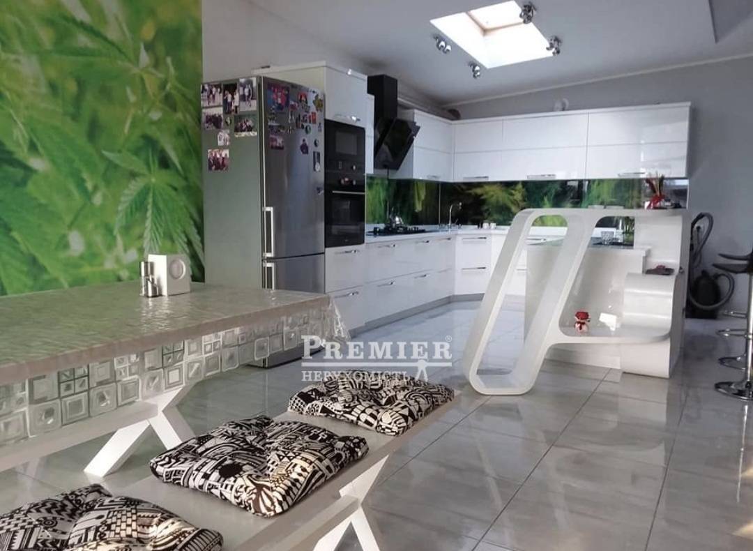 Перший поверх будинку вражає великою кухнею площею 80 м² з панорамними вікнами, яка ідеально підходить для сімейних вечерь та зустрічей. У затишній вітальні – панорамне вікно з видом на фруктовий сад. У будинку три окремі спальні з кондиціонерами та великими вікнами, дві кухні, санвузол та ванна кімната. Опалення здійснюється за допомогою двоконтурного газового котла. Будинок обладнаний охоронною системою для безпеки мешканців.