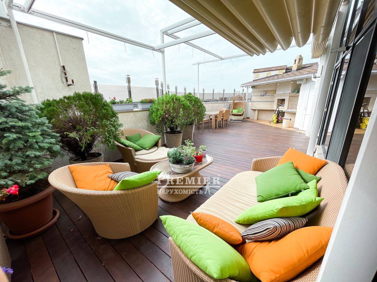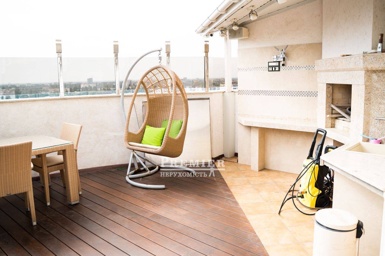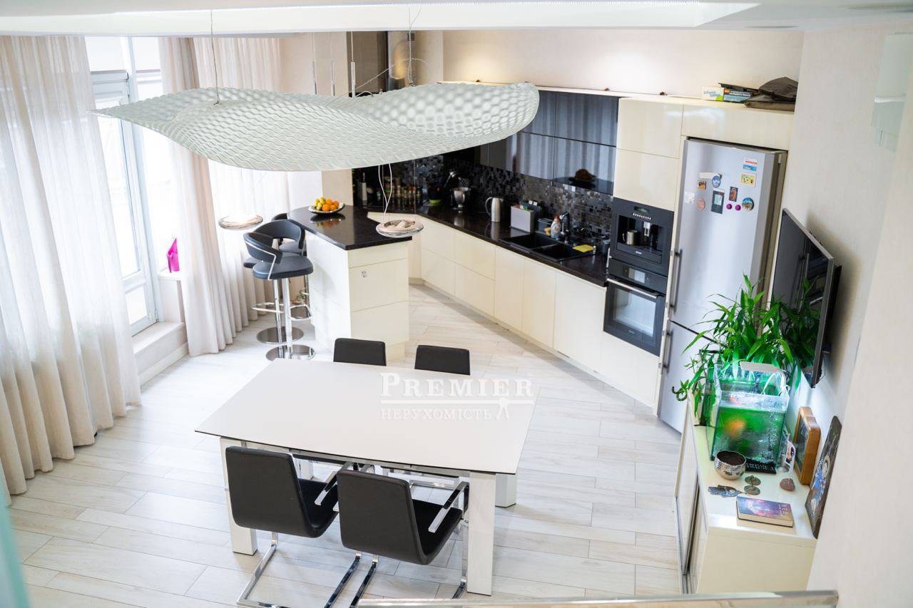 Ласкаво просимо до квартири мрії! Ця прекрасна 3-х рівнева квартира, з виходом на терасу розміром 60 м2 і дивовижним видом на місто. На першому поверсі знаходяться 2 дитячі кімнати та майстер спальня 3 вбиральні. На другому поверсі кухня їдальня з виходом на терасу. На терасі скління Паритет, автоматизована маркіза з датчиком погодних умов, система вентиляторів та туманних розпилювачів води, вбудована зона барбекю, терасна дошка – бразильський бук, меблі з ротанга, На третьому поверсі розташований домашній кінотеатр, барна стійка бар холодильник. На кожному поверсі є санвузол ванна та душова. По всій квартирі встановлена система Розумний будинок. Авторський ремонт. Відеоспостереження, пожежна система, охорона, акустика у всій квартирі. Плитка та сантехніка, меблі провідних світових брендів Італії та Іспанії. Чудова шумоізоляція від сусідів. У будинку є паркінг, навпроти будинку гостьова парковка. Будинок розташований в парковій зоні-Парк Перемоги У Будинку охороняється двір із закритим дитячим майданчиком.