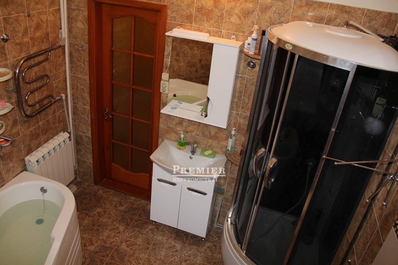 S = 120 м.кв. 1-й рівень: 3 спальні (18; 25; 15), кабінет, кухня-їдальня, 2 санвузли, сауна, класичний ремонт, санвузол облицьований. Автономія, 2-х контурний котел, лоджія, тристороння, вікна - євробрус, камін. 2-й рівень: S = 160 м.кв. з висотою 4 м., з вікнами, виведено опалення, вода, газ, зроблена стяжка. Можливість 2-х рівневої квартири із загальним метражем S = 280 м.кв. Шикарний будинок «Менестрелі». Терміново!