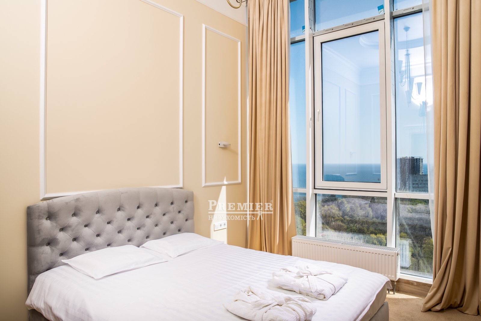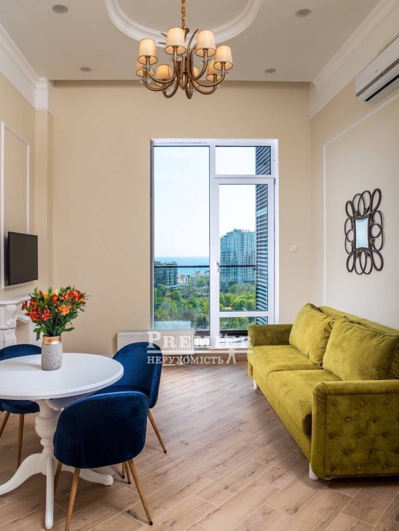 Пропонується до продажу видова квартира з дизайнерським ремонтом на Французькому бульварі з сучасному житловому комплексі Грінвуд. Квартира укомплектована дорогою технікою і меблями зробленої на замовлення. Великі панорамні вікна з видом на море і Ботанічний сад. Південна сторона. Стелі 3 м. Квартира дуже світла і тепла, обладнаний санвузол, містка гардеробна і балкон. В апартаментах німецькі підлоги з підігрівом, чеська сантехніка