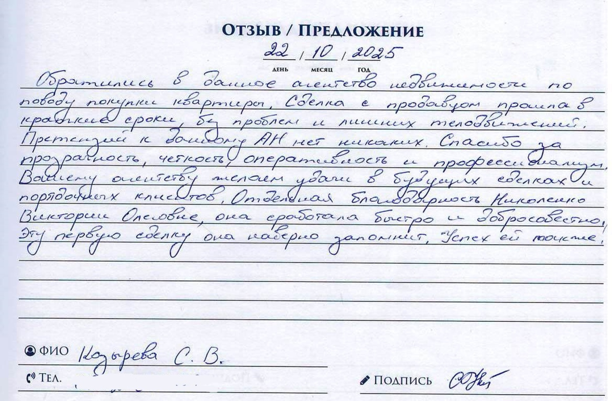 Обратились в данное Агентство Недвижимости по поводу покупки квартиры. Сджелка с продавцом прошла в краткие сроки, без проблем и лишних телодвижений. Претензий к данному АН нет никаких. Спасибо за прозрачность, четкость, оперативность и профисионализм. Вашему агентству желаем удачи в будущих сделках и порядочных клиентов. Отдельная благодарность Николенко Виктории Олеговне, она сработала быстро и добросовестно. Эту первую сделку она наверное запомнит. Успехов ей так же.