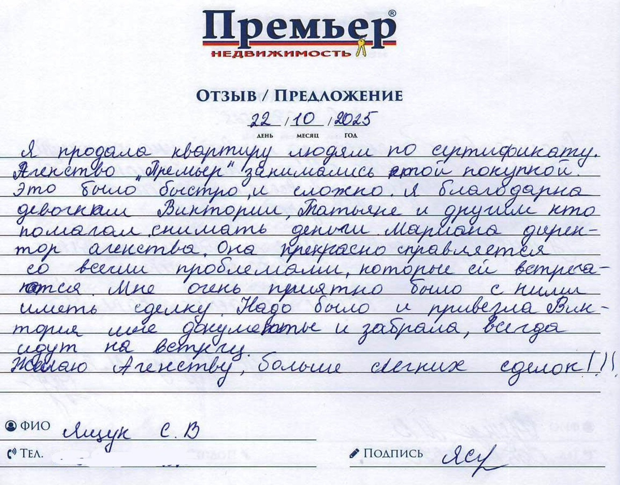 Я продала квартиру людям по сертификату. Агентство "Премьер" занимались этой покупкой это было быстро, и сложно. Я благодарна девочкам Виктории, Татьяне и другим кто помогал снимать деньги. Марианна директор агентства. Она прекрасно справляется со всеми проблемами, которые ей встречаются. Мне очень приятно было с ними иметь сделку. Надо было и привезла Виктория мне документы и забрала, всегда идут на встречу.