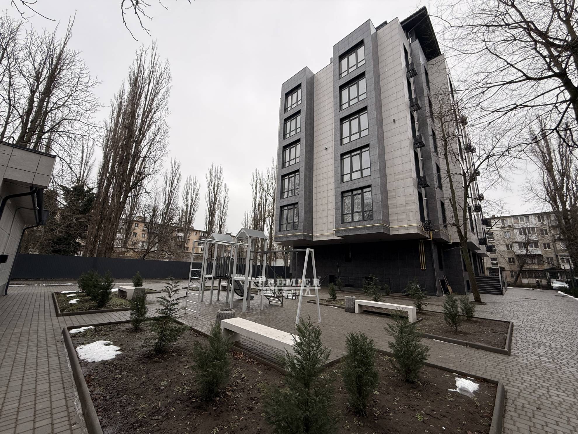 Проектом предусмотрено благоустройство придомовой территории с высадкой зеленых насаждений и цветочных клумб. Выделяются места для отдыха и пеших прогулок. Территория покрывается тротуарной плиткой. По периметру функционирует круглосуточная охрана с видеонаблюдением. В комплексе устанавливается современная противопожарная система с соответствующими атрибутами.