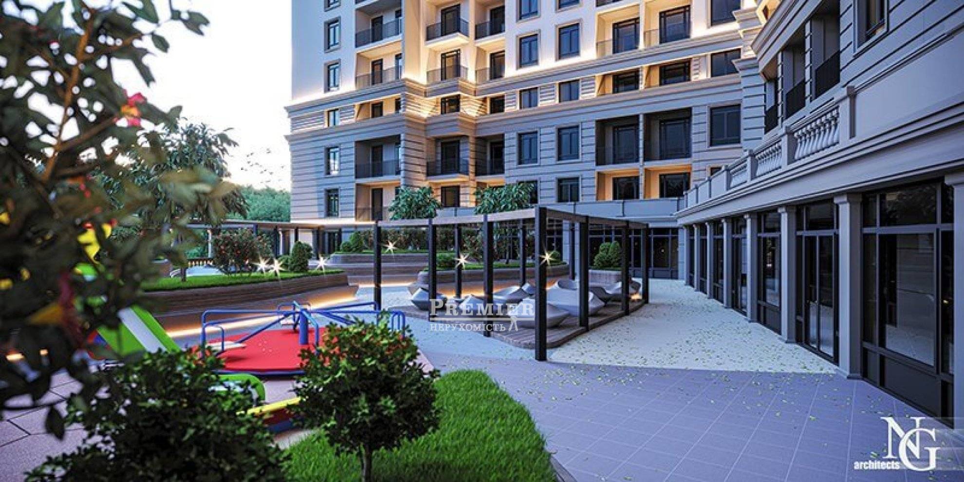 Прибудинкова територія огороджується. По периметру розміщуються камери відеоспостереження, а комплекс знаходиться під цілодобовою охороною. Сама територія озеленюється і прикрашається квітковими клумбами. На ній монтуються дитячі та спортивні майданчики, місця для відпочинку і прогулянок. Вона повністю висвітлюється, а доріжки покриваються тротуарною плиткою. У комплексі діє модернізована протипожежна система з датчиками, сигналізацією і необхідним обладнанням.