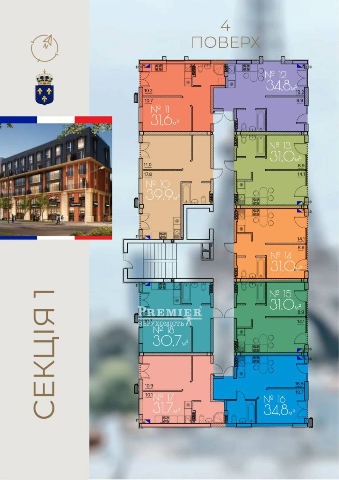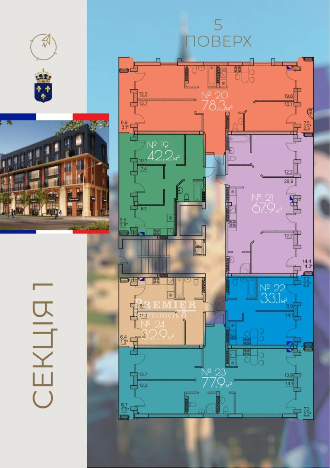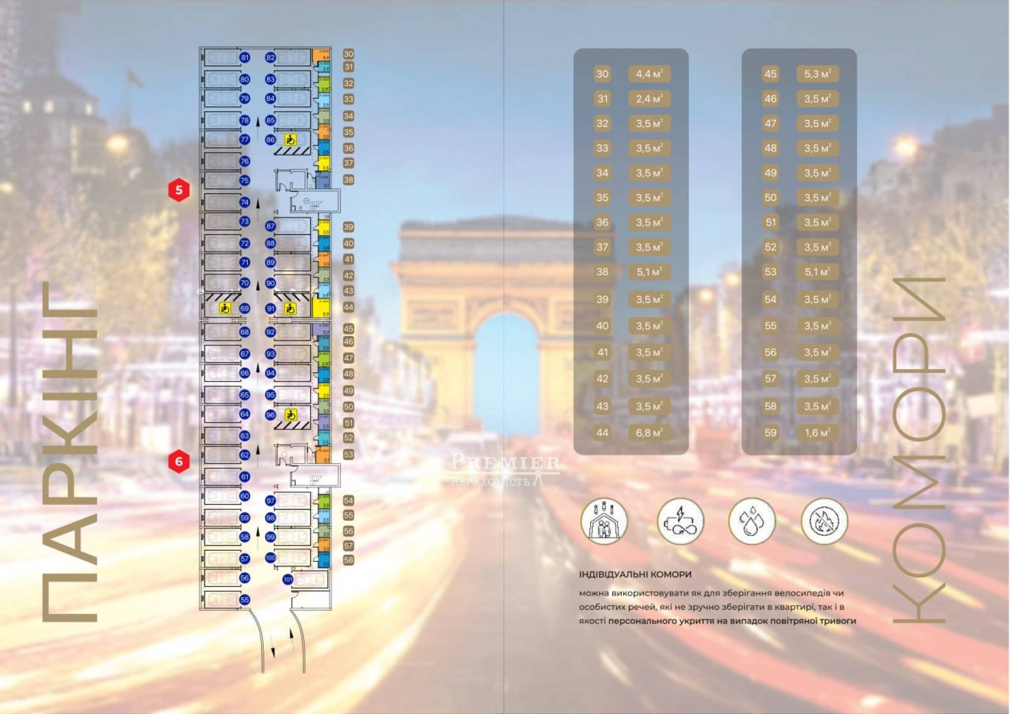 Комплекс невисокий – він складається з 6 поверхів та трьох секцій. Монолітно-каркасний тип конструкції забезпечить надійність будови за будь-яких зовнішніх впливів. Стіни виконані з газобетону, їх товщина – 300 мм, а фасад задекорований атмосферостійкою фарбою і додатково утеплений. Це дозволить захистити житло від вітрів та інших негативних кліматичних впливів. Вікна з панорамного шестикамерного профілю завжди допоможуть зберігати тепло та бажану тишу. На першому та другому поверсі розмістилися офіси – їхня площа становить від 30 до 300 кв. метрів. У комплексі можна придбати однокімнатну, двокімнатну або трикімнатну квартиру із зручним плануванням площею від 30 до 78 кв. метрів. У кожній квартирі передбачено індивідуальне газове опалення, що дозволить мешканцям самостійно регулювати температуру та встановлювати її у будь-який час. У кожній секції є ліфт, який спускається у зручний підземний паркінг. Закрита територія, що охороняється, красиво облаштована і обладнана системою відеоспостереження, це стане гарантією безпеки. Мешканцям не доведеться переживати і про перебої з енергопостачанням, адже тут передбачено потужний генератор, а також аварійне водозабезпечення для кожної квартири.