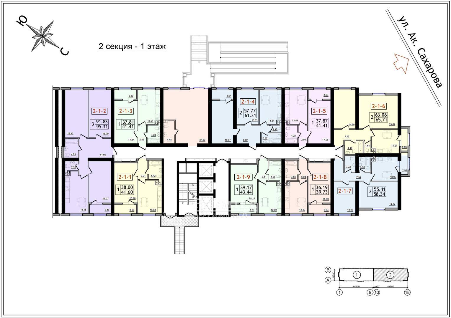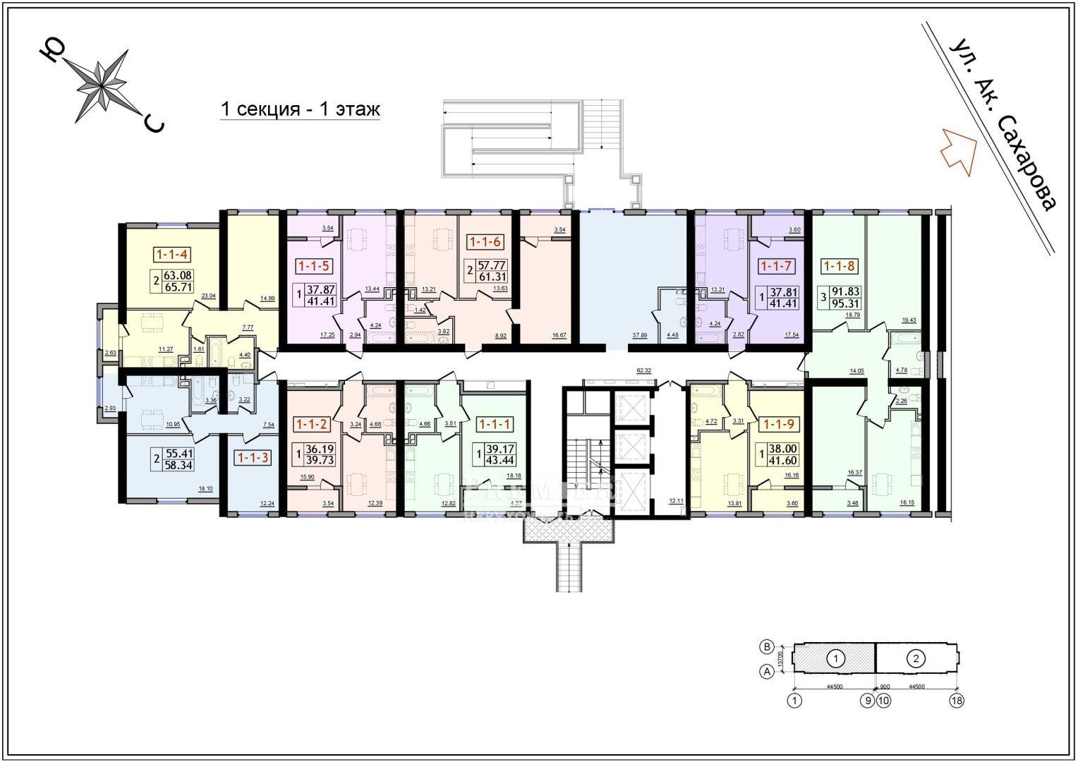 Однокомнатные квартиры | от 41,32 м² до 44,97 м² | |